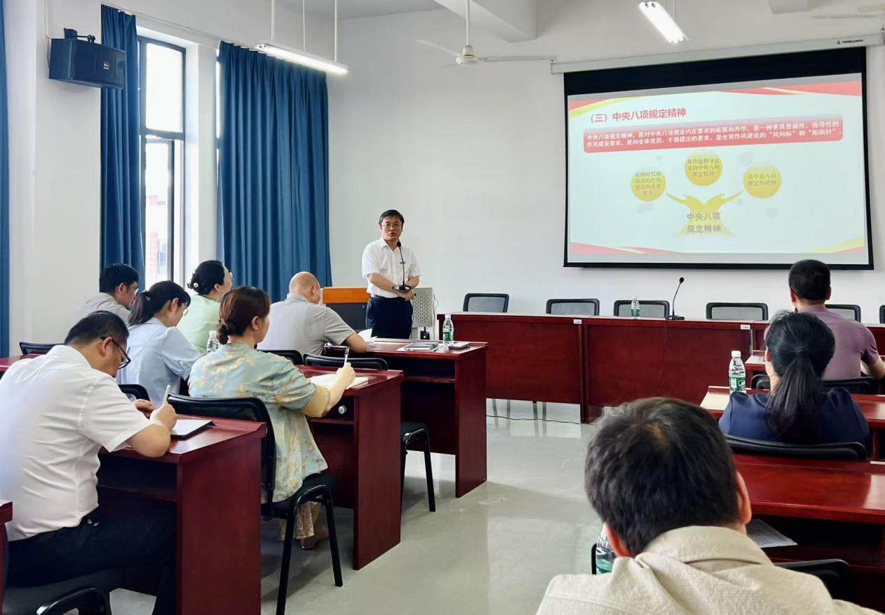 7月1日,学校党委常委、副校长黄孝天以《扎实开展深入贯彻中央八项规定精神学习教育——以优良作风护航学校高质量发展》为题,为党员干部讲授深入贯彻中央八项规定精神学习教育专题党课。